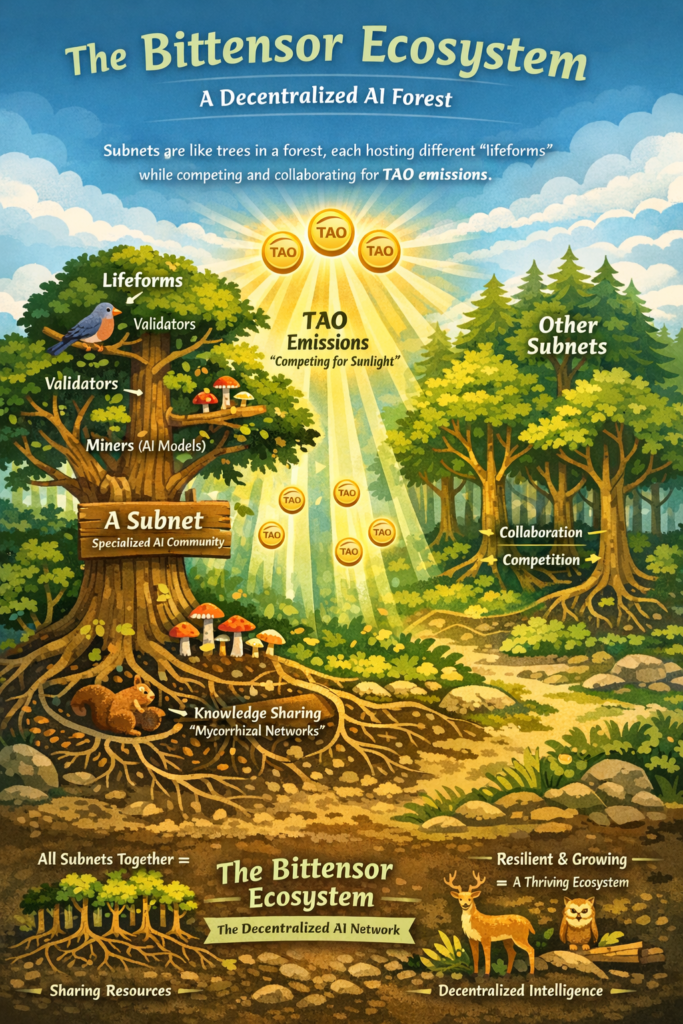 This growing landscape becomes an emerging forest: a dynamic, evolving ecosystem where many different plants (called subnets) share the same ground (planet Bittensor). Each tree hosts many lifeforms (miners, validators, stakers), competing for sunlight — the TAO emissions that help them grow and thrive — and sharing nutrients through underground networks of collaboration.