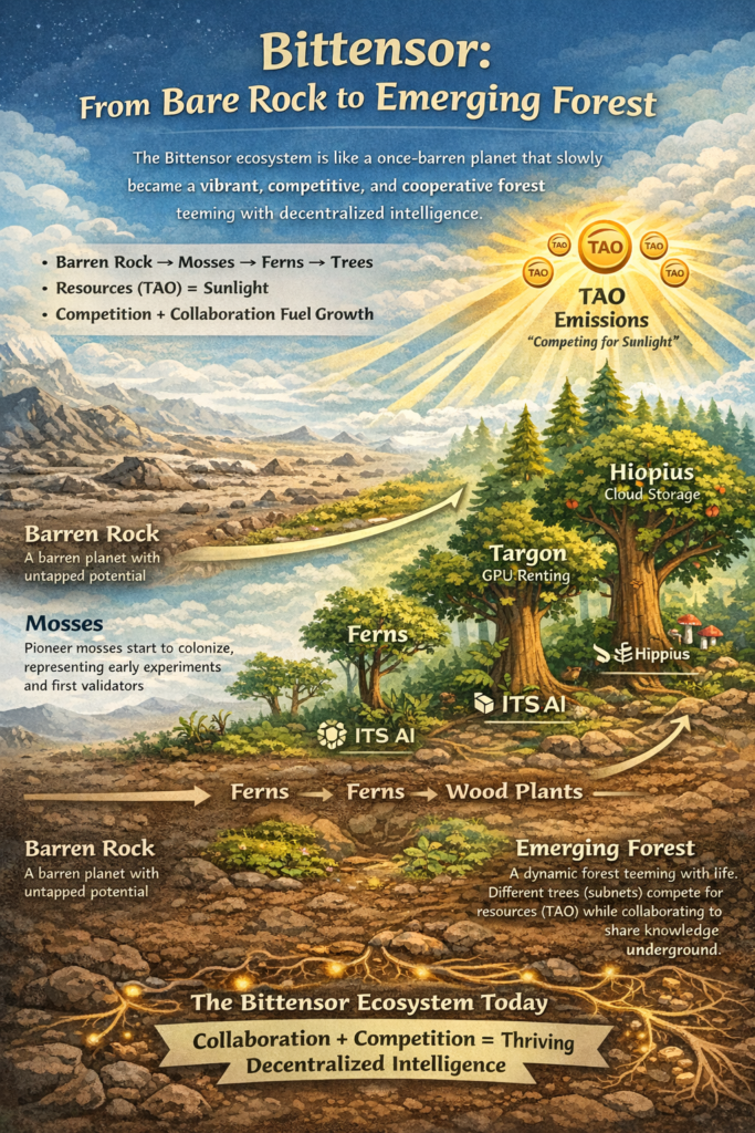 To really understand the Bittensor ecosystem, imagine a bare, rocky planet — empty, quiet, and full of potential. It’s called ‘Bittensor’. At first nothing grows. But slowly, life begins to appear: